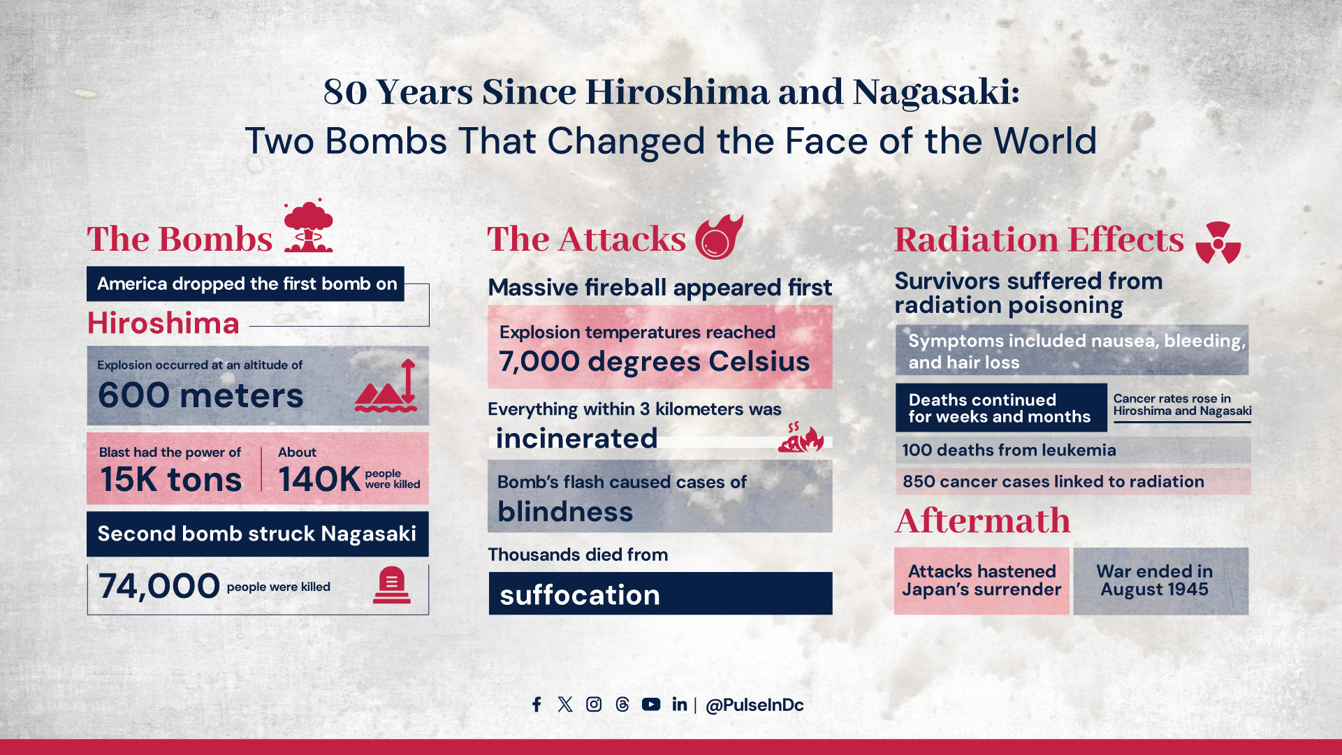 Eighty years after the atomic bombings of Hiroshima and Nagasaki, the world still grapples with the legacy of two explosions that killed over 210,000 people and unleashed a new era of nuclear warfare. The United States dropped the first bomb on Hiroshima, generating a 15,000-ton blast at 600 meters above ground, followed by a second bomb on Nagasaki days later. The attacks incinerated everything within a 3-kilometer radius, caused mass blindness, and suffocated thousands. Survivors faced prolonged suffering due to radiation poisoning, which led to cancer, leukemia, and decades of medical trauma. While the bombings ended World War II in August 1945 by forcing Japan’s surrender, they also ignited an ethical and strategic debate that continues to shape global policy on warfare, peace, and nuclear weapons.
