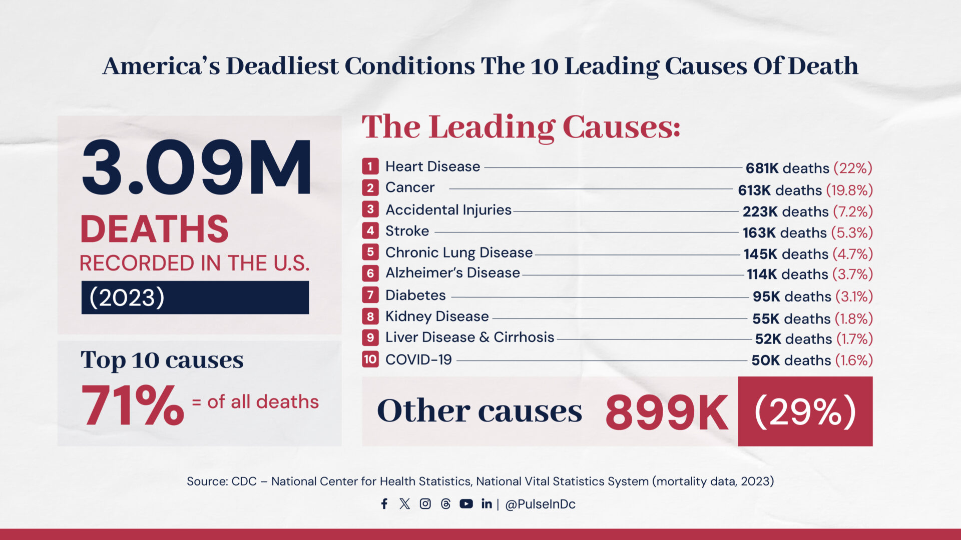 Heart disease and cancer remain the leading causes of death in the United States, according to new CDC data, showing that the top 10 causes together account for over 70% of all U.S. fatalities in 2023.