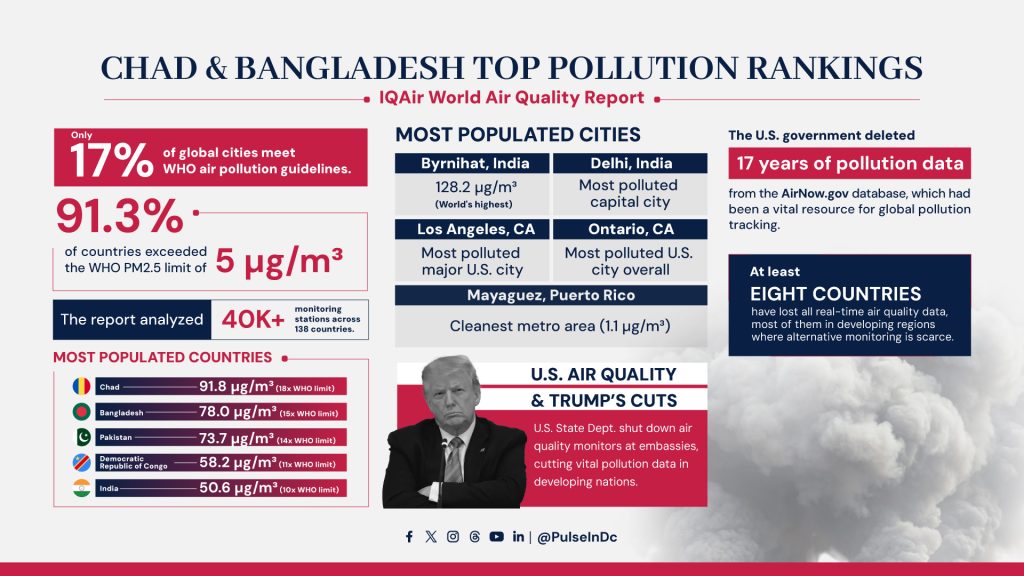 The latest IQAir report reveals that Chad and Bangladesh lead the world’s pollution rankings, while the U.S. has shut down global air quality monitoring, cutting off crucial data for many developing nations.