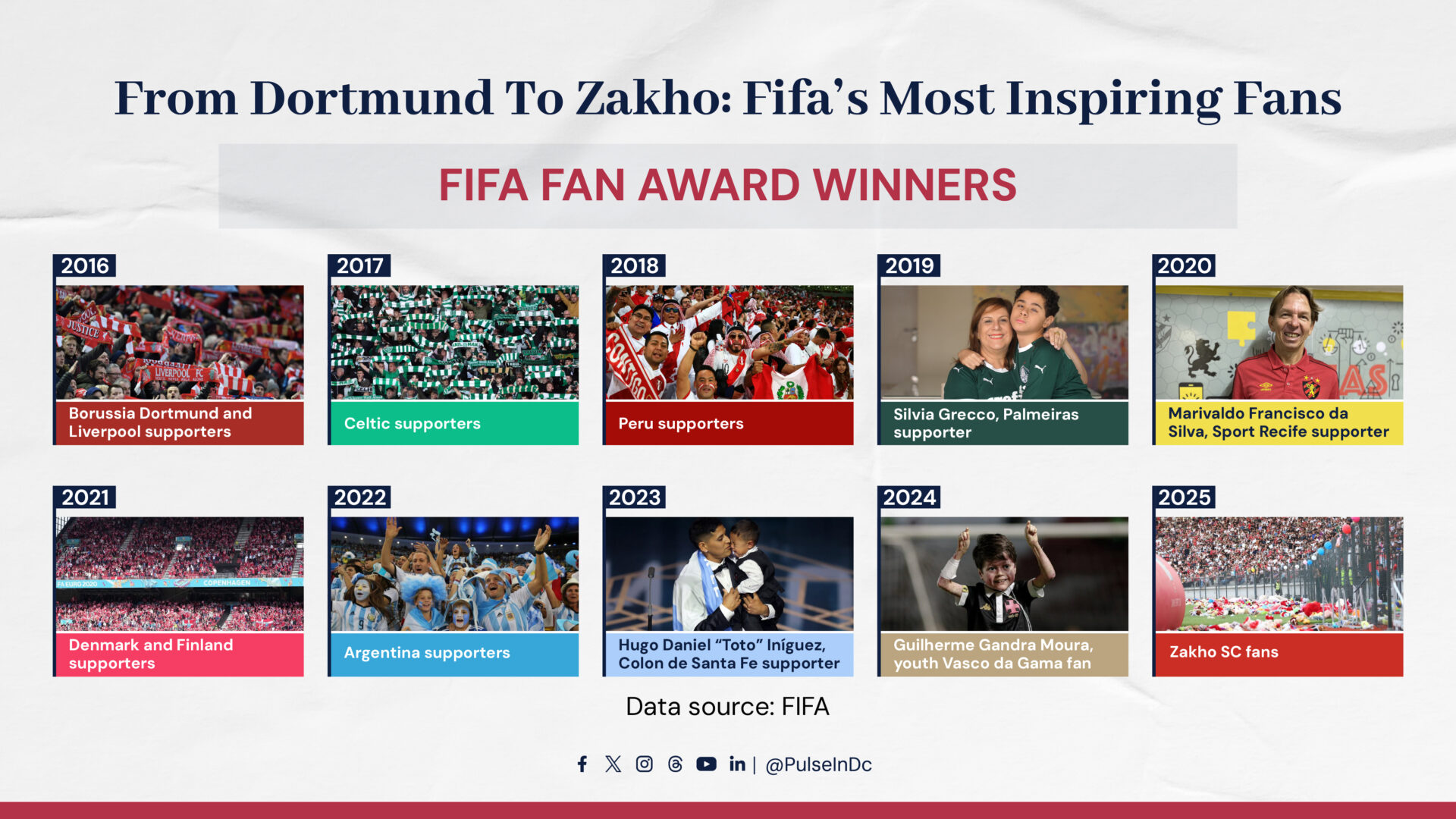 Since its launch in 2016 with Borussia Dortmund and Liverpool fans, the award has highlighted unforgettable gestures, from Celtic supporters’ solidarity, Peru’s emotional World Cup journey, and Silvia Grecco helping her blind son experience football, to Brazilian, Danish, Finnish, Argentine, and youth fans whose passion inspired the world.