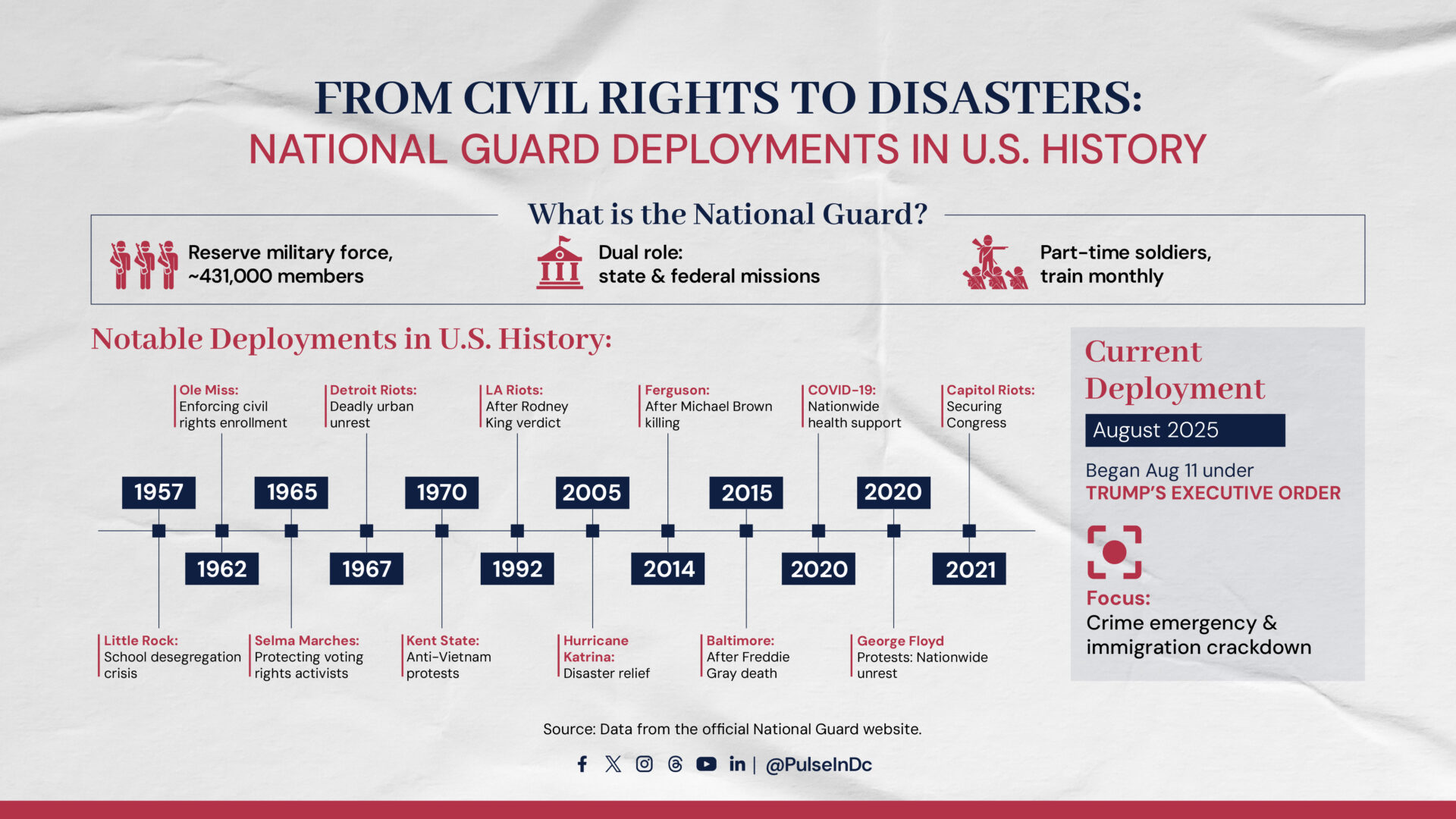 A visual timeline of when and why the US National Guard has been deployed, from civil rights to disasters and today’s federal missions.