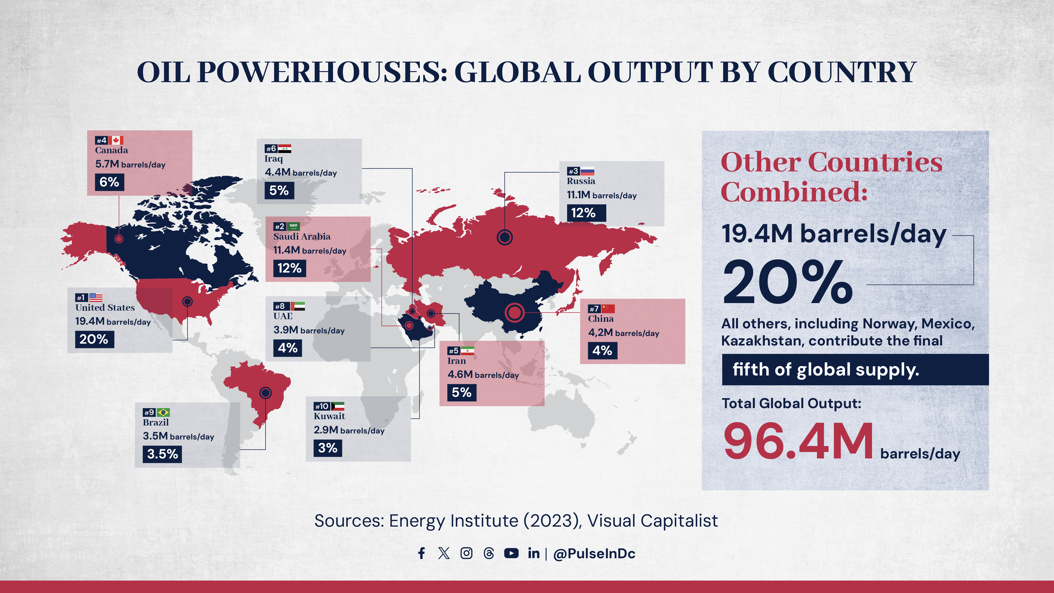 Who dominates the oil world? This graphic breaks down the biggest producers by daily output, with the U.S., Saudi Arabia, and Russia leading the pack.