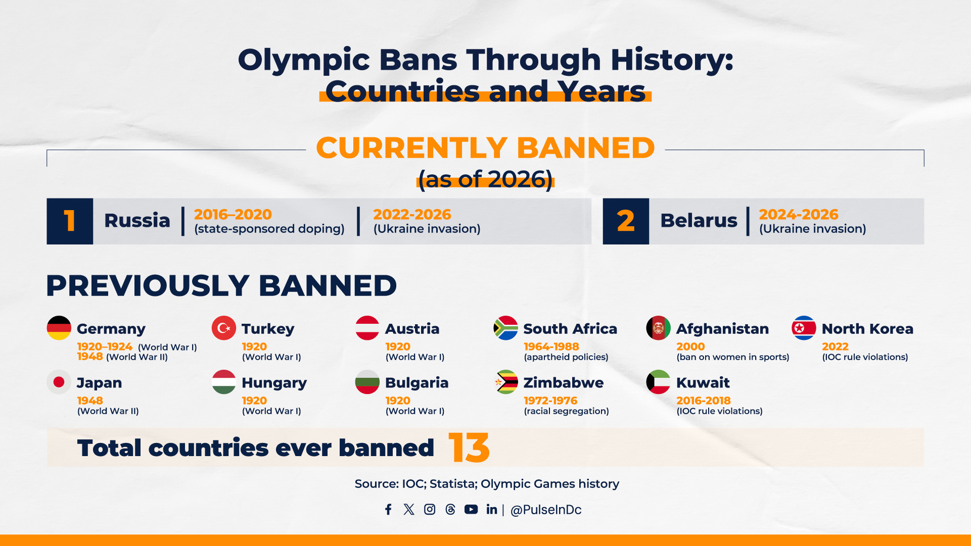 Thirteen countries have been banned from the Olympic Games since 1920, with exclusions linked to war, human rights violations, doping scandals, and breaches of Olympic rules.