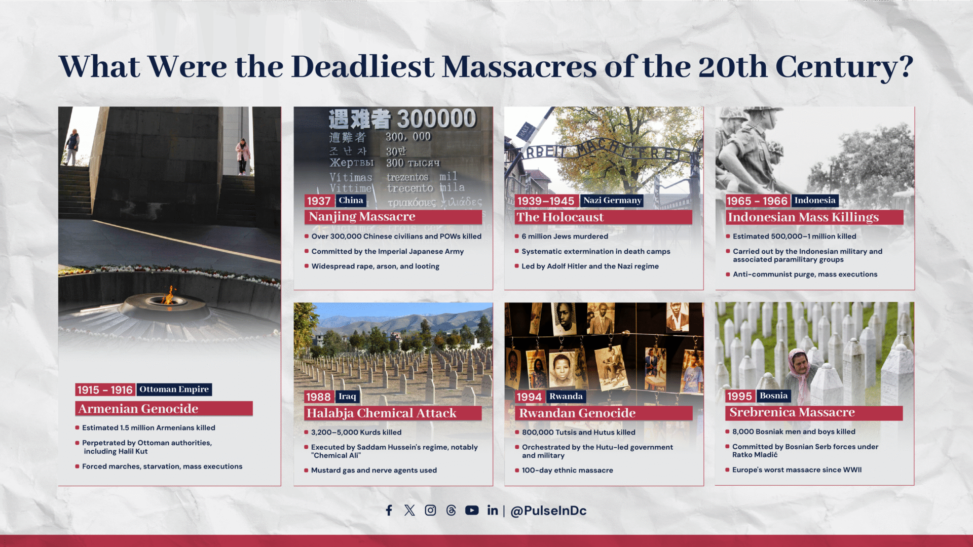 Other brutal events include the Nanjing Massacre by Japan, the Indonesian anti-communist purge, Iraq’s chemical attack on Halabja, the Rwandan Genocide, and the Srebrenica massacre during the Bosnian war.