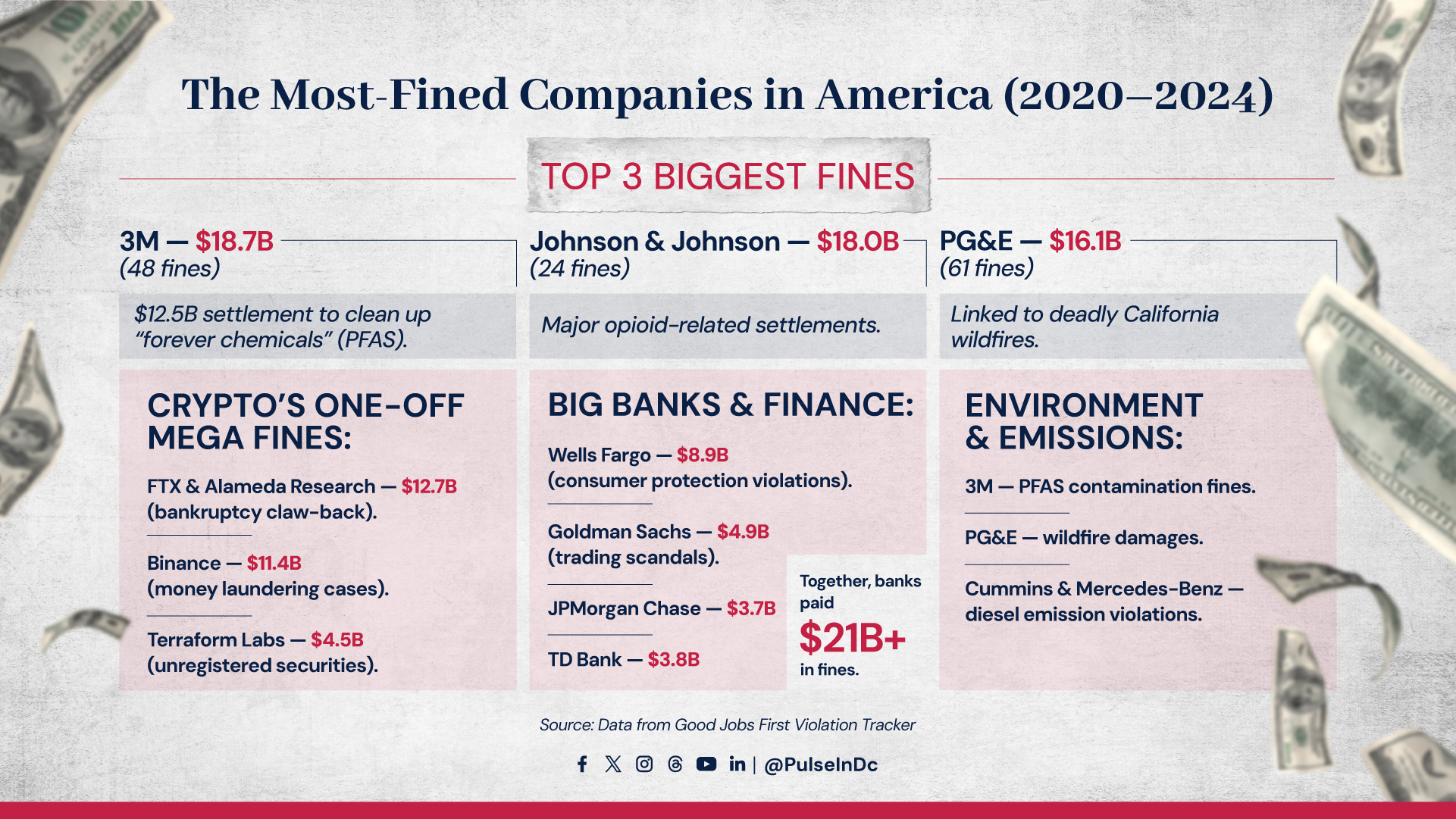 Between 2020 and 2024, U.S. regulators issued more than $250 billion in fines to major corporations, with healthcare, crypto, banks, and environmental polluters topping the list.