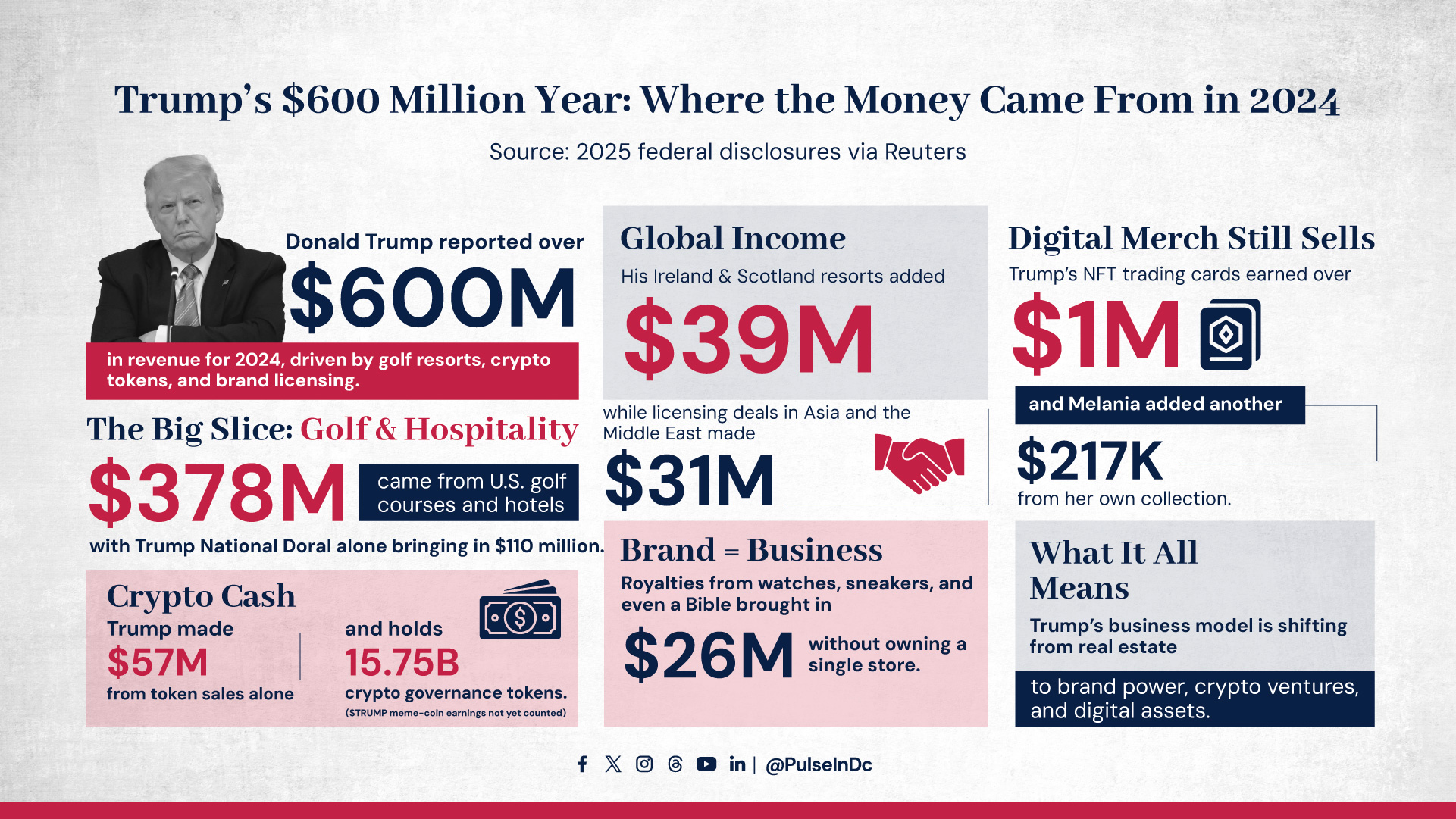 From golf and hotels to token sales and merchandise, Trump’s 2024 income reveals a diversified, brand-driven business model.