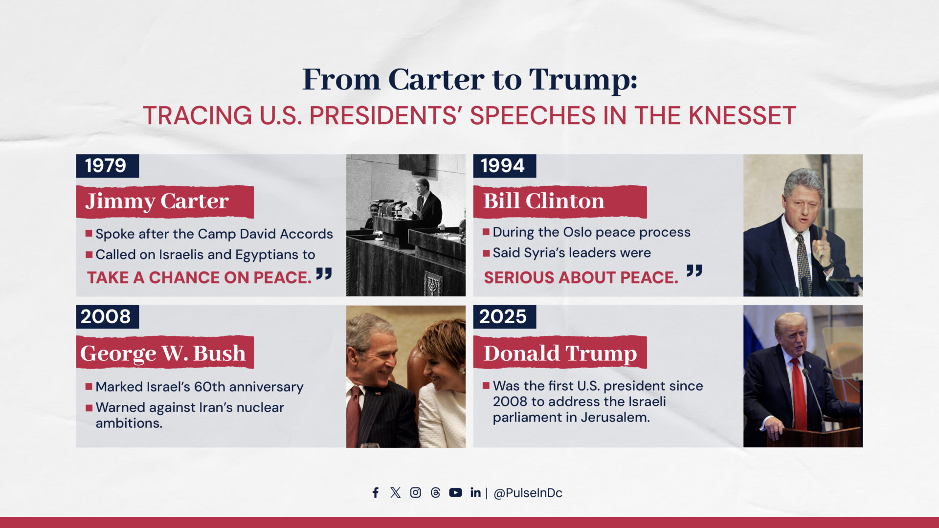Donald Trump became the fourth U.S. president to address Israel’s Knesset, joining Jimmy Carter, Bill Clinton, and George W. Bush in a historic moment marking renewed U.S. involvement in Middle East peace efforts.