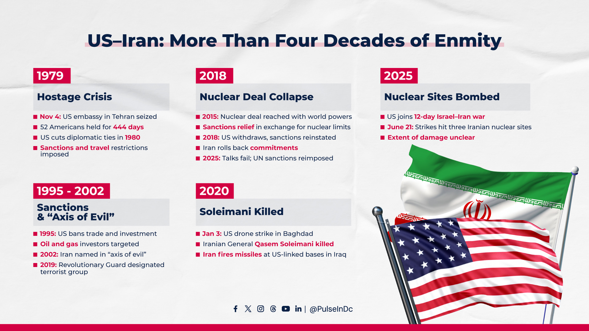 The enmity began with the 1979 Islamic Revolution and the 444-day hostage crisis at the US embassy in Tehran, which severed diplomatic ties and triggered decades of sanctions.