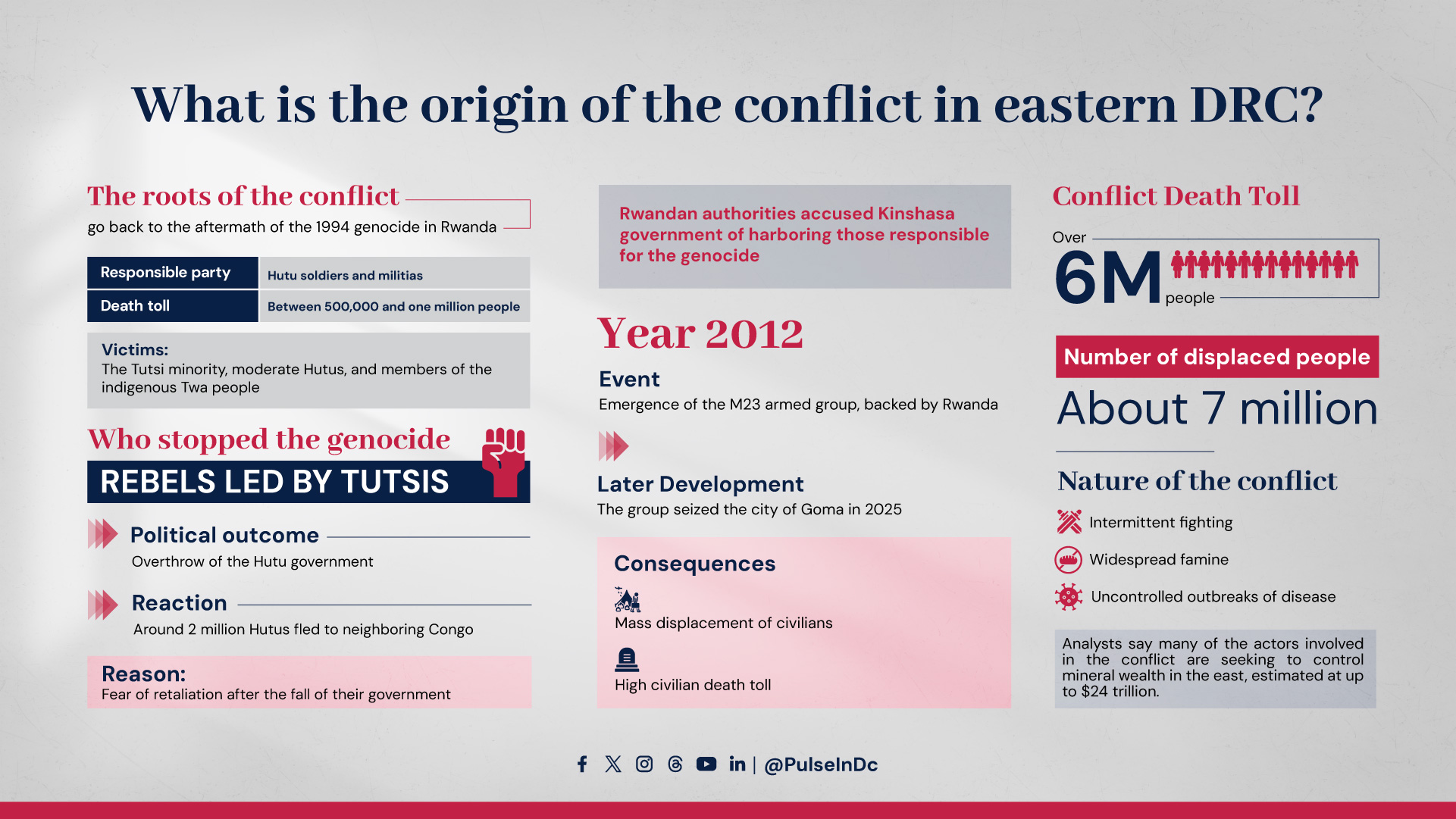The conflict in eastern Democratic Republic of Congo stems from the aftermath of the 1994 Rwandan genocide, leading to decades of violence fueled by ethnic tensions, mass displacement, and a fierce struggle over vast mineral resources.