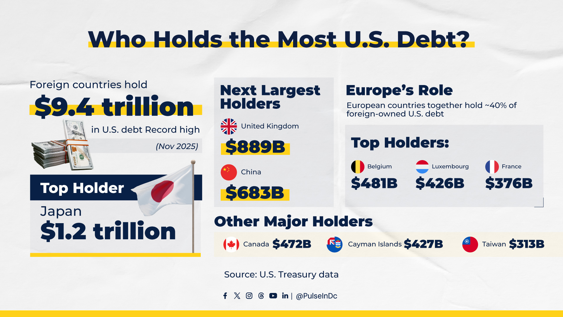 Foreign countries now hold a record $9.4 trillion in U.S. Treasuries, with Japan remaining the largest overseas owner of American debt.