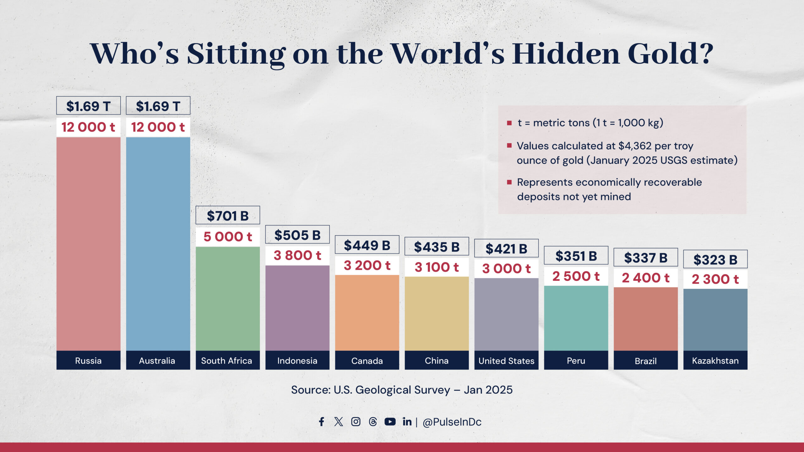 Russia and Australia top the 2025 ranking for the world’s largest unmined gold reserves, each holding an estimated 12,000 metric tons worth nearly $1.7 trillion.