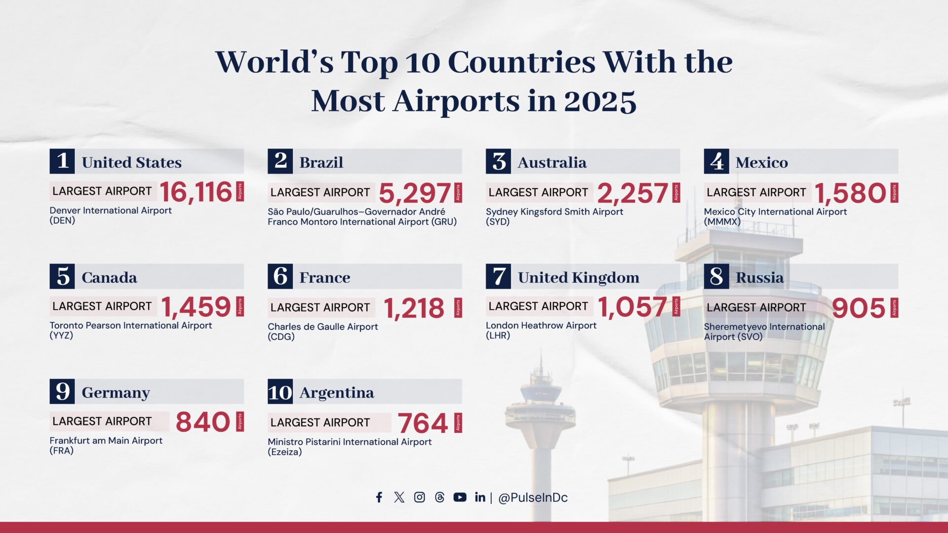 Mexico, Canada, France, the United Kingdom, Russia, Germany, and Argentina complete the top 10, each maintaining a network of airports crucial for passenger travel, cargo, and economic activity.
