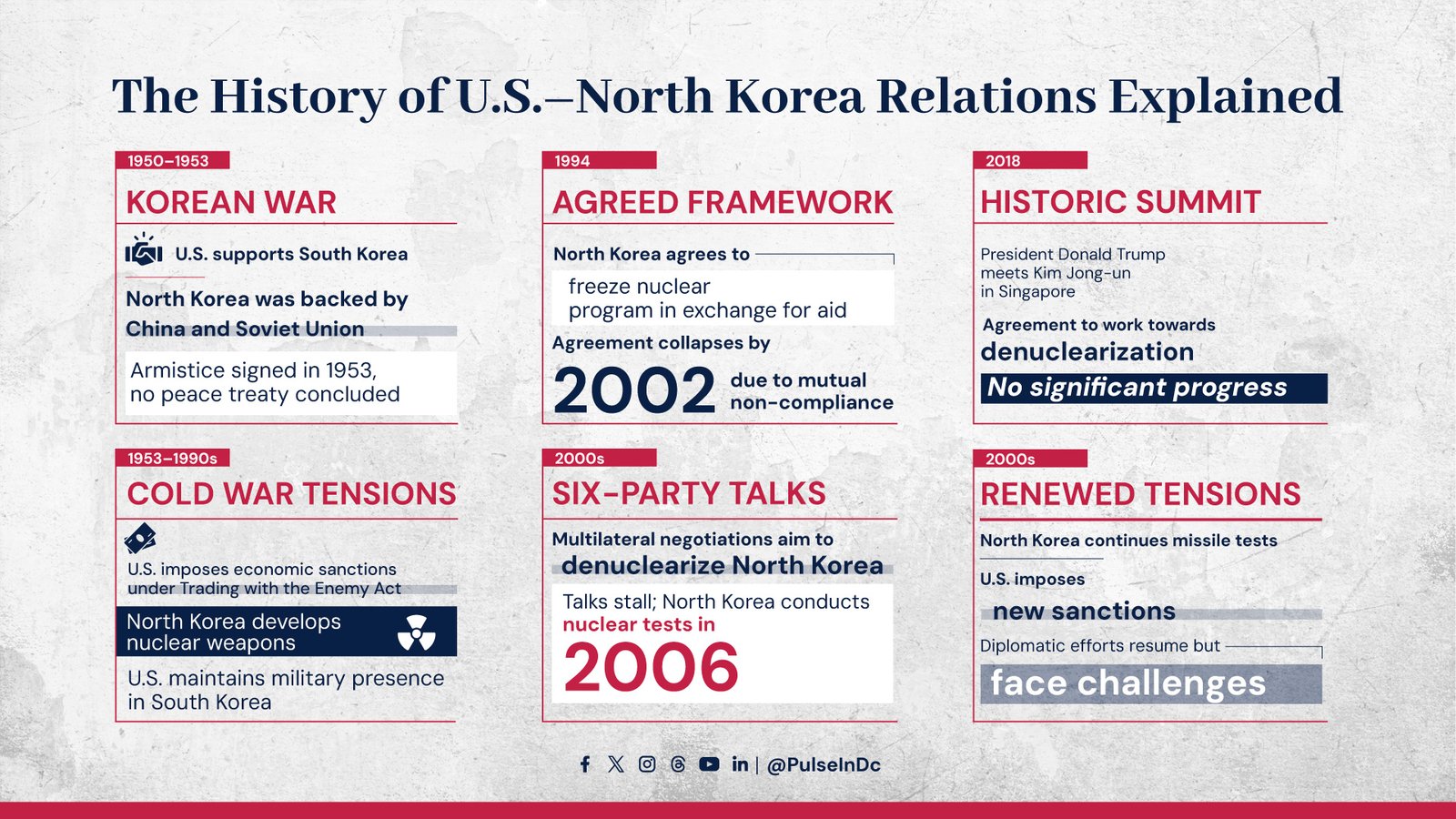 From the Korean War in the 1950s to today’s missile tests and sanctions, U.S.–North Korea relations have swung between open conflict, stalled negotiations, and rare moments of diplomacy. Key events include the 1953 armistice, Cold War tensions, the failed 1994 Agreed Framework, the breakdown of Six-Party Talks, Donald Trump’s 2018 summit with Kim Jong-un, and ongoing disputes in the 2020s.